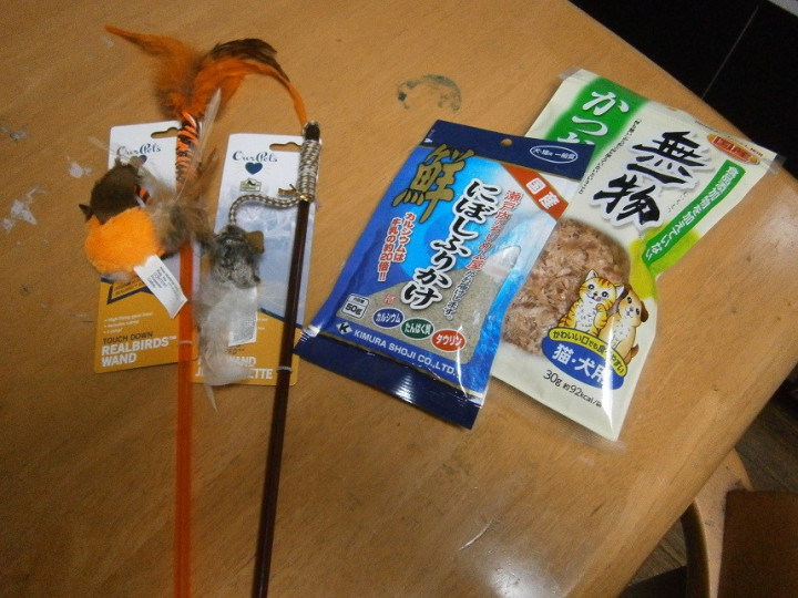小鳥っぽいのと、ネズミのじゃらし。 電池が内蔵されていてちゃんと鳴くみたいです^^