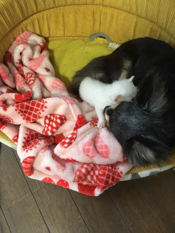 実家にいる出産経験のあるチワワのべーちゃんが、お腹の中にロニーを抱いて甲斐甲斐しくお世話してくれています。