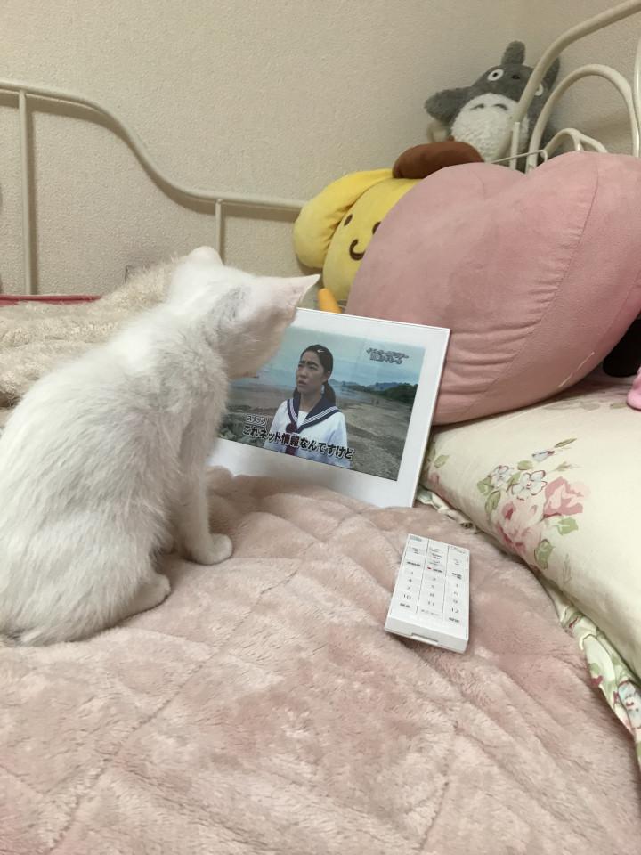 レオンは二カ月でテレビを見るニャンコでした。しかも画面はイモトさん笑