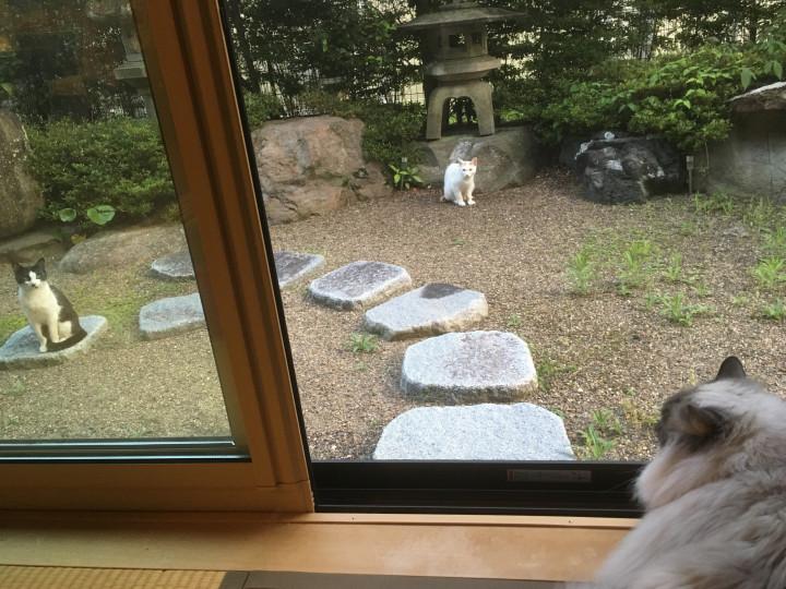 家から外に出た事のないヌリーは、自由に外を駆け回る猫ちゃんに興味津々!時折、ニャーニャーと3匹で会話しているようで、微笑ましい光景でした。(*^_^*)