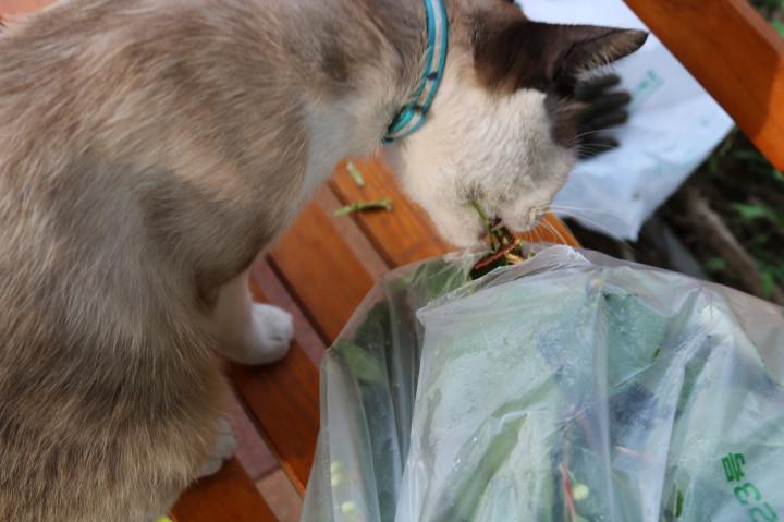 採りたてのマタタビが詰まった袋を、もう白が破いてる。