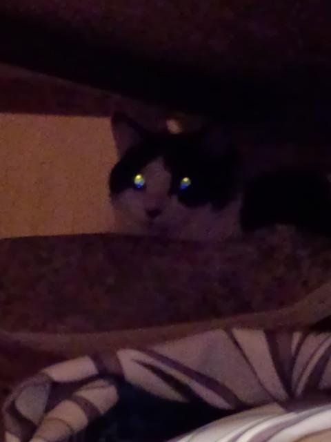 だいとちぃーのすけはいつもの食器棚の上に駆け上がり イカ耳& 目はランラン😹