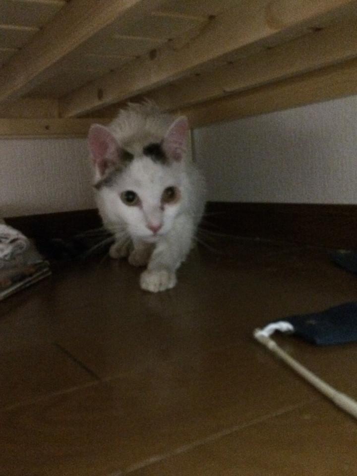 落ち着いて居場所を聞き出すと、やはり真下のお家。ベランダに置いてあった荷物の裏に隠れていました。