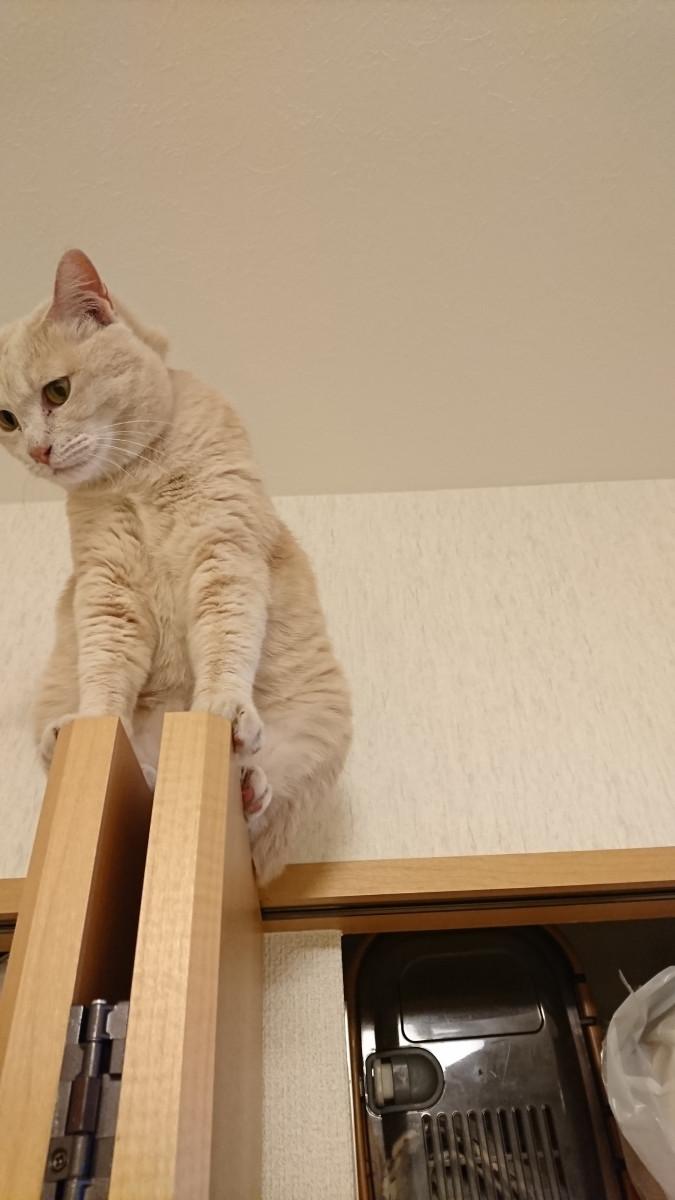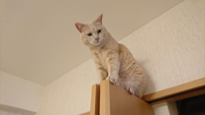 ガタガタするので見に行ったらクローゼットの開けた扉の狭い幅の上に上手に乗ってました😅