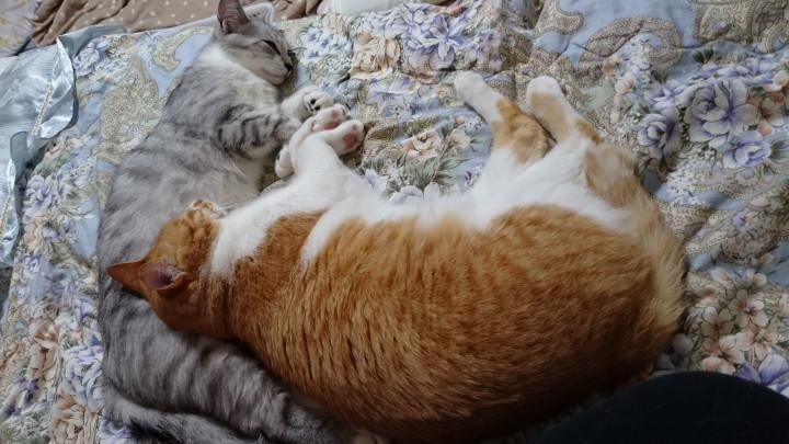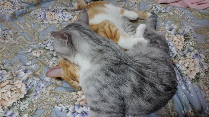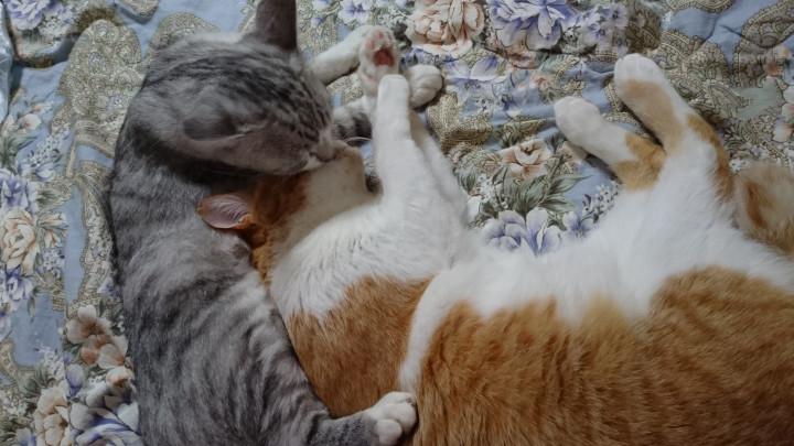 特に寝ぼけているときは普段喧嘩ばかりのにこちゃんにペロペロと毛繕いしてあげております。にこちゃんは甘えん坊さんなので嬉しそうです。
