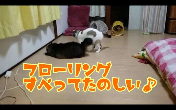フローリングで鈴やボールもにゃんずも滑る滑る~♪