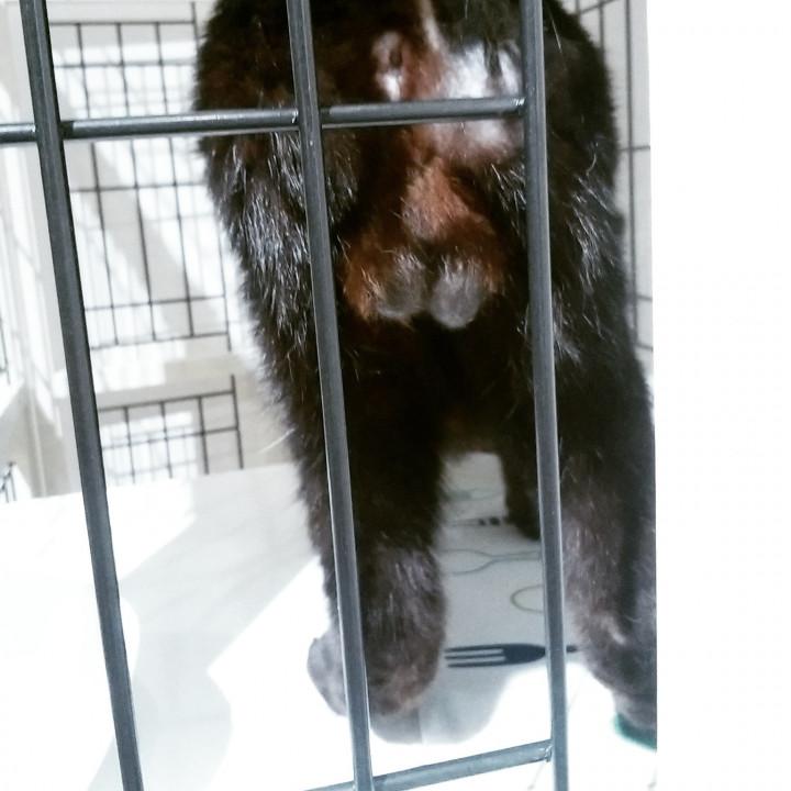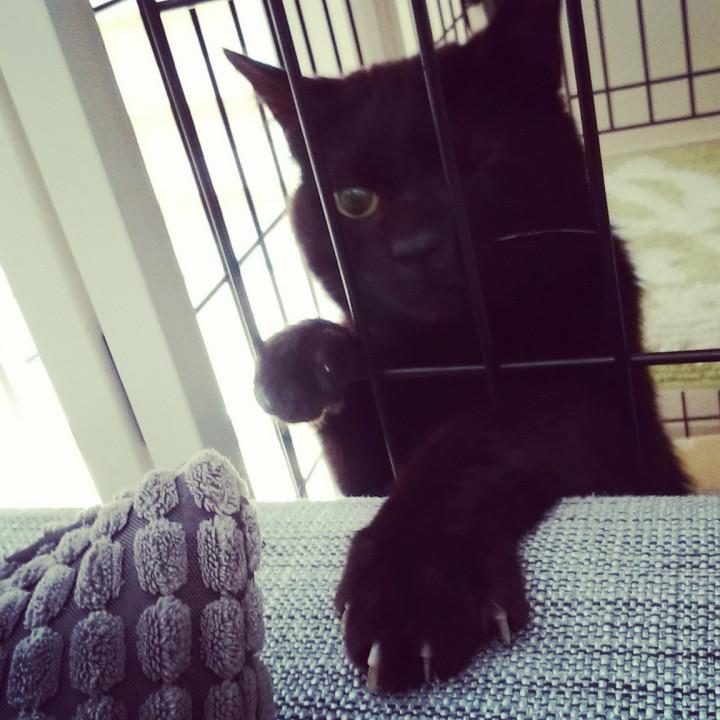 ソファの縁に頭を乗せてると、ケージから手を出して私の頭をポンポンと叩いてくる黒にゃ氏。