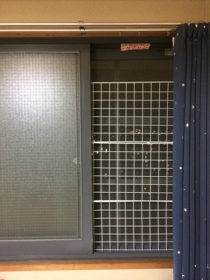 ウィンドウクーラーがあってこれ以上窓が開く事はないので、ガムテで固定ひた網戸の手前、窓枠にワイヤーネットをはめ込みました。
