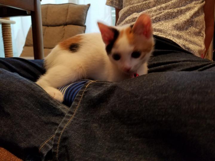 まめちゃん、うちのダンナさんの膝の上で寛いでます・・・さらっちゃうよ?
