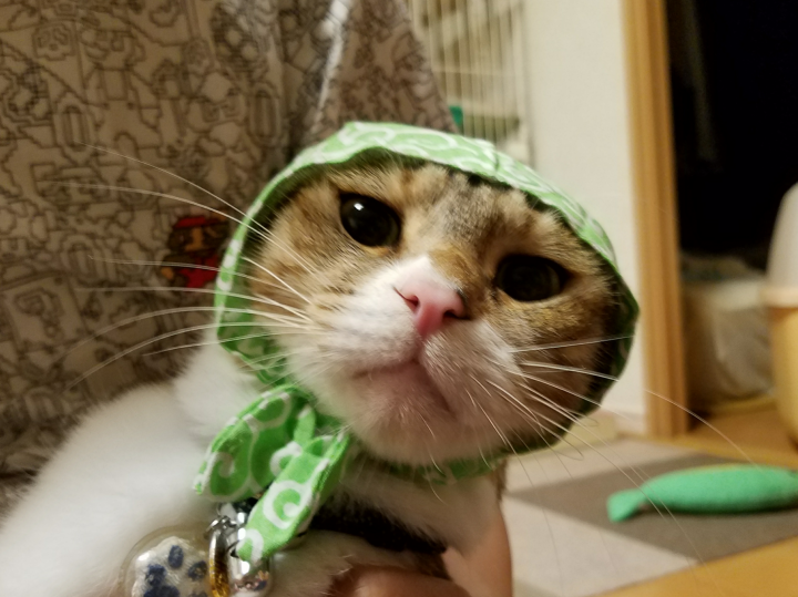 じゅんたさんにいただいた緑のほっかむり、4匹に順番に被せてみた結果↓↓↓
