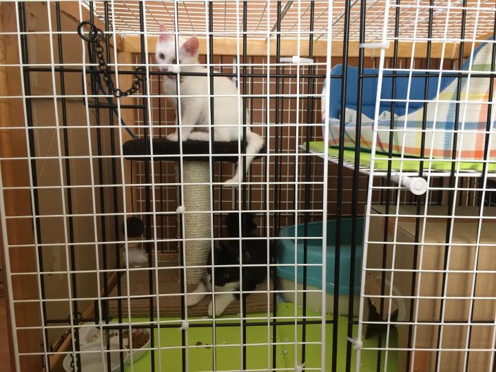まだ片付けていない手作り猫ゲージに2匹を入れました。