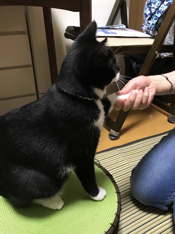 オヤツをもらう時は、この丸台の上で握手すればもらえると思って犬のように片手をくいくい出して来る(笑)