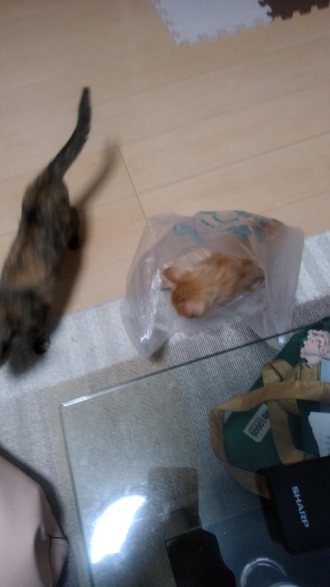 レオ君はとっても買い物袋が好きで直ぐに袋中に、それを見て私もとココアちゃんも入ろと考えていた瞬間、お母さんに袋を持ち上げられました。💮