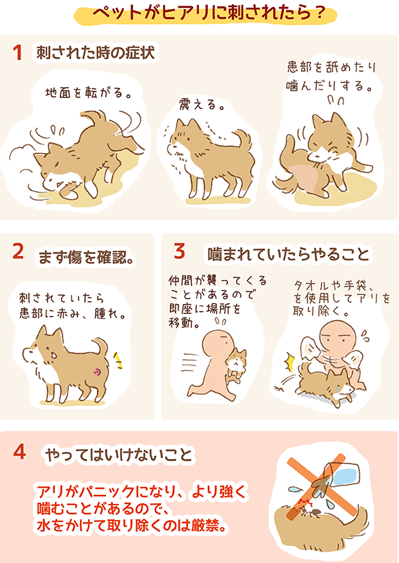 ってことで、お散歩中にヒアリに刺された際の処置方法、わかりやすくイラストでまとまられたものが
