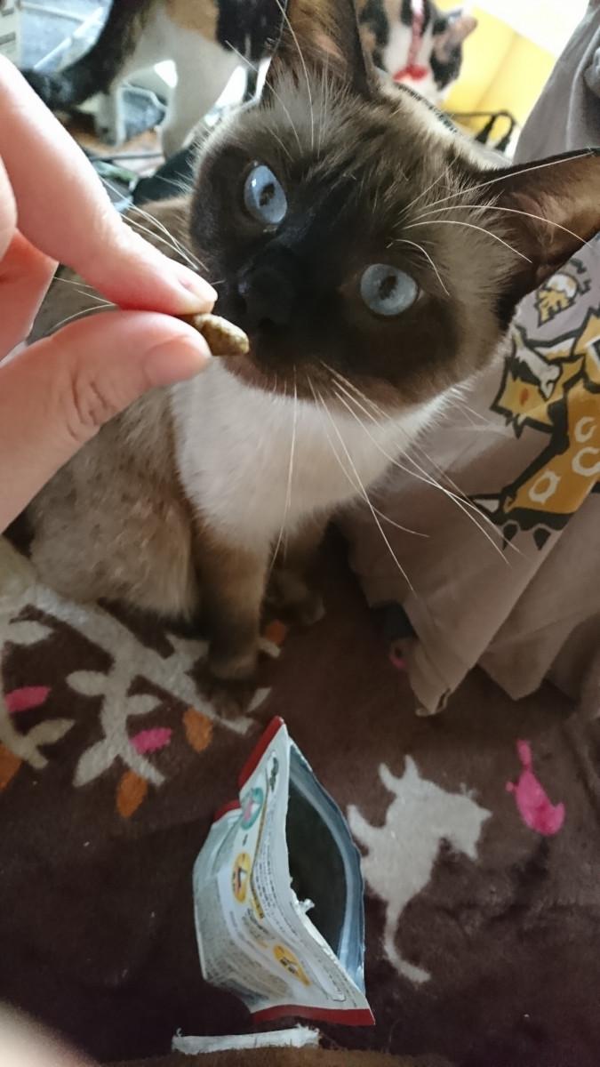 おやつを見つめてる。