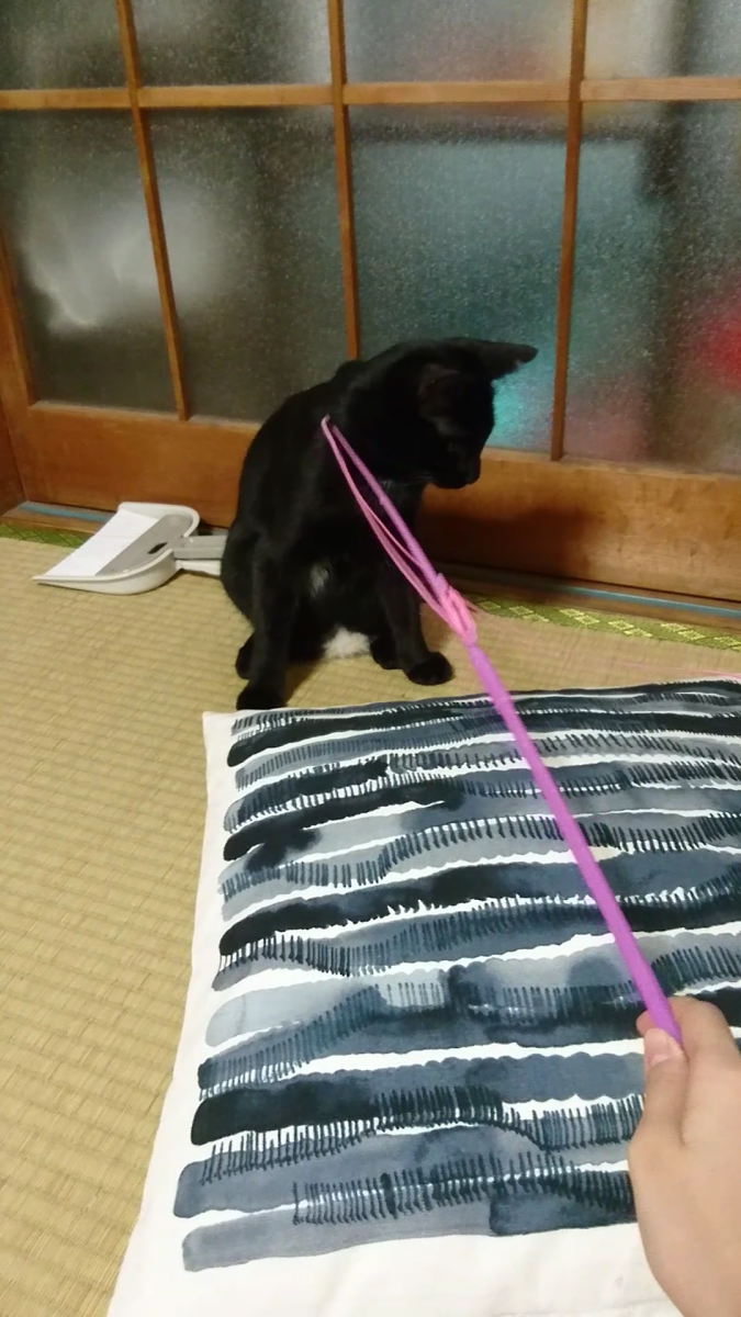 そしてそして、昨日の夜ですが猫じゃらしの釣り竿の先っちょで、ナデナデ?することができました