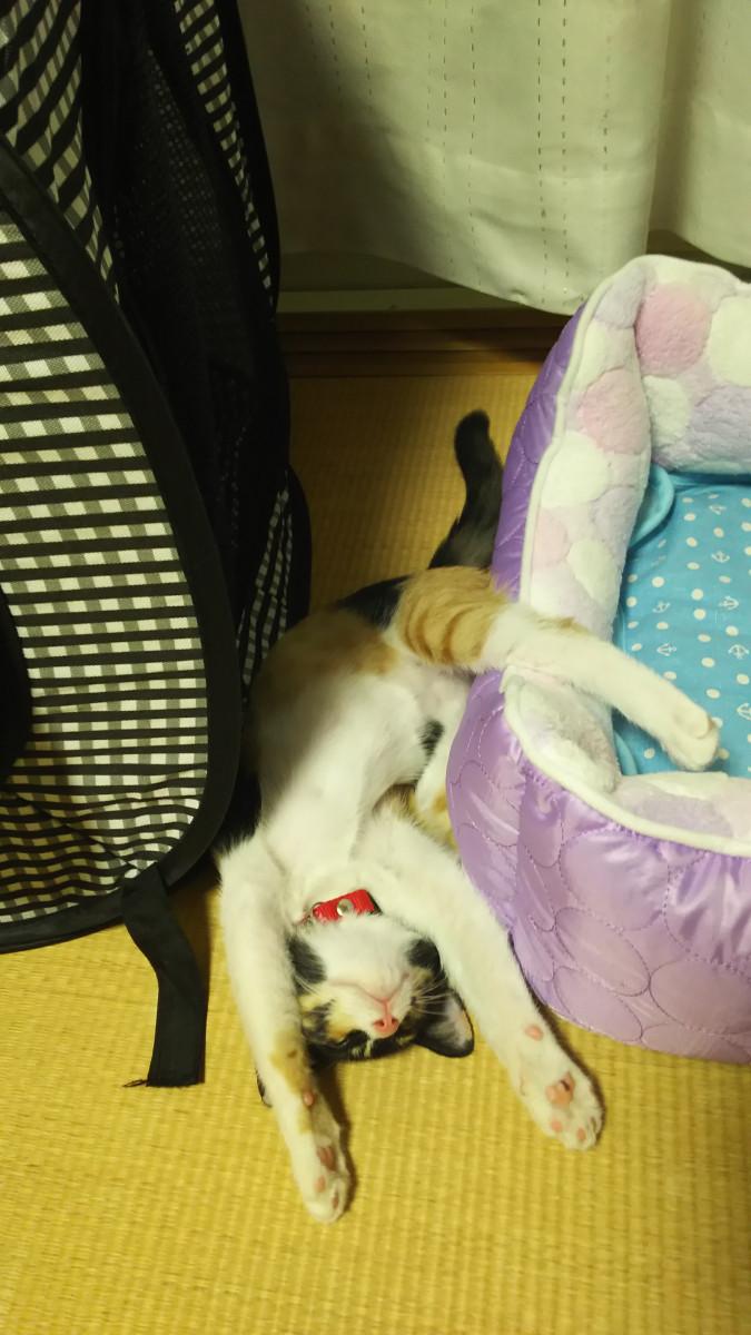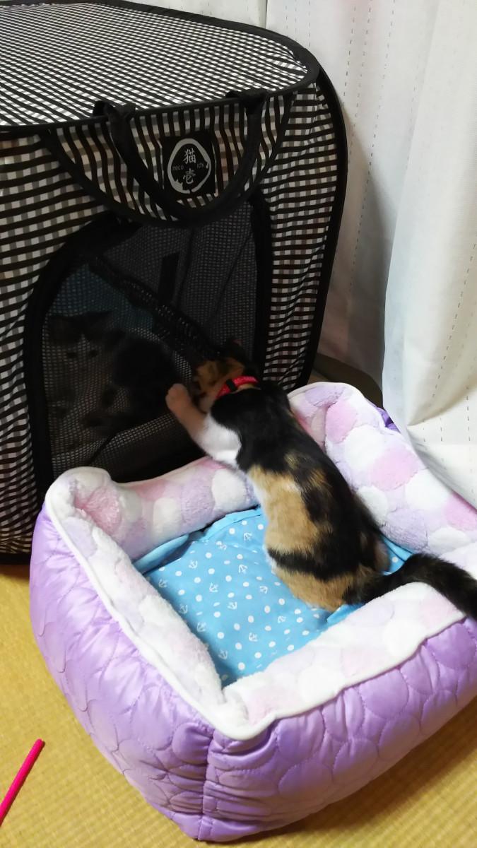 ゲージ外に置いてあるトイレも使えてるし、水飲み場とかも把握して、そろそろゲージも不要かなぁと考えながら、昨日はまだ夜だけゲージに。