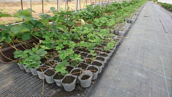 根っこが出て、空いてる鉢が無くなったら切り分けて追肥や手入れをして、ハウスに植えるまで管理します。
