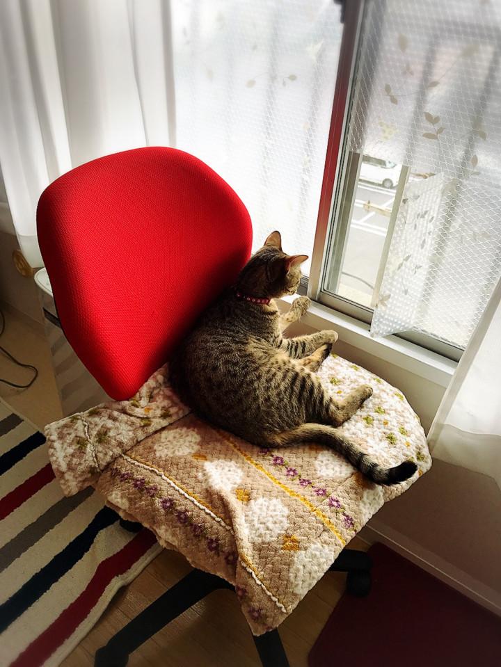 冷房が直で当たる場所なので明日の背で直接あたらないようにしたら特に居心地がいいようでずーっとそこにいるようになりました(^。^)