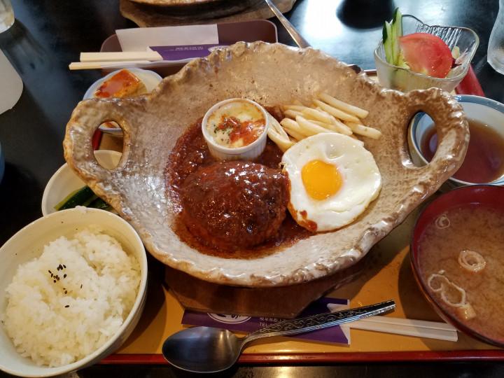 ハンバーグ(付け合わせは目玉焼き、ポテト、ミニグラタン)、ご飯(小どんぶりの大きさ)、味噌汁、サラダ、冷奴(醤油じゃなくお味噌?がかかってた)、これで1480円はなかなかのコストパフォーマンス✨