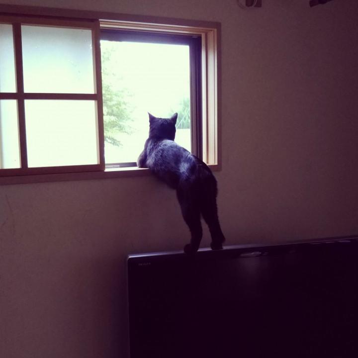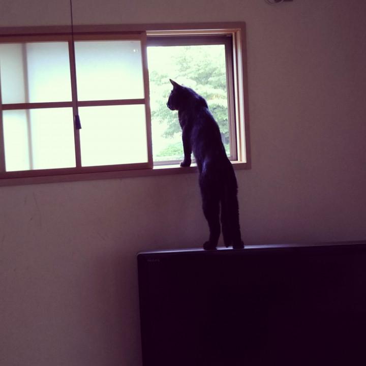 今朝もテレビに登って学童たちの登校を見守ってました。