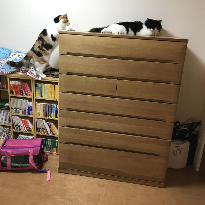 むぎちゃんのお気に入りの場所に飛び乗りました。むぎちゃん、気になって仕方ない様子。