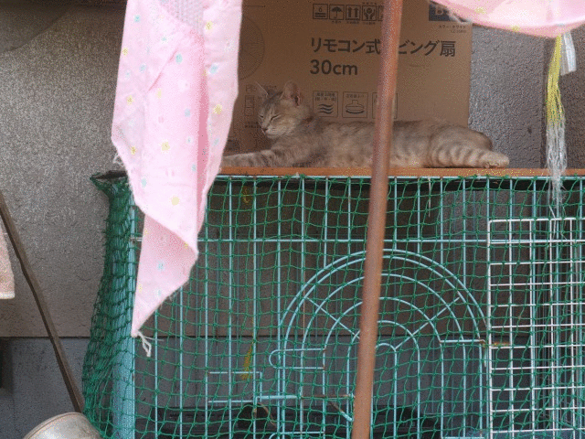 ママ猫、キジママ、は静かに見ている。三毛ちゃんだけはチビのところで座り込み、シャーシャー言ってる。