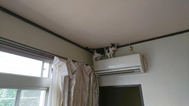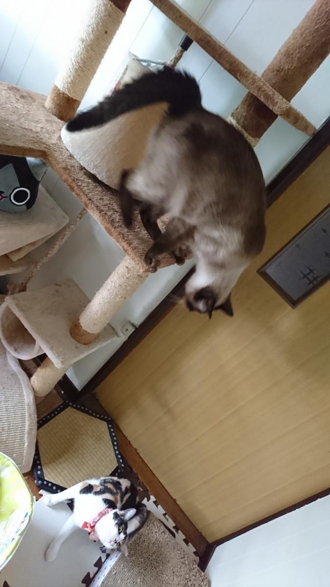 キャットタワーから軽やかなステップを踏む小春さんに、キャットタワーに見事にぶつかる大福。。