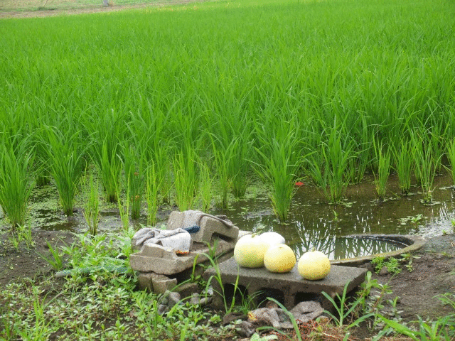 田んぼの隅に小さなメロンが三つ置いてある。