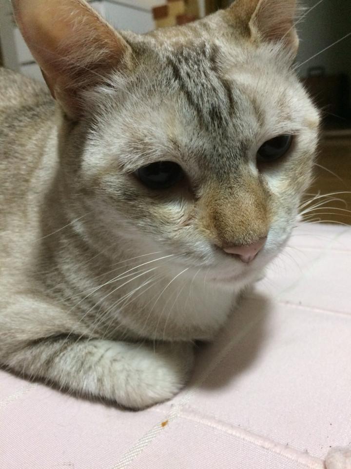 左目の上、毛が薄い所は、細胞を採取するために毛を剃った所です
