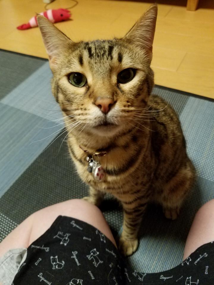 ソファに座ってネコジルシやってるカリタをじーーーーっと見つめ、「おやつくれ~❗」ビームをと飛ばしてるんですよ~😅
