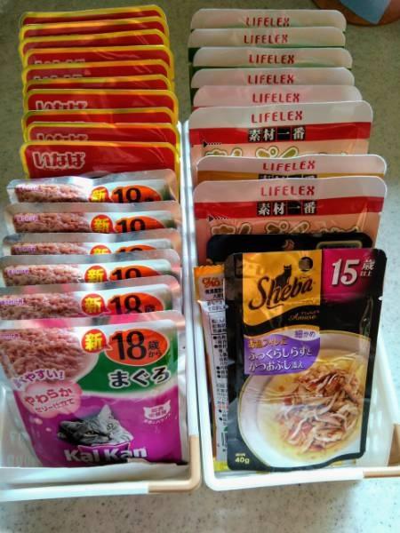自分の食べ物よりも、こうやって買い溜めした猫さんフードを眺めるのが至福の時間♪