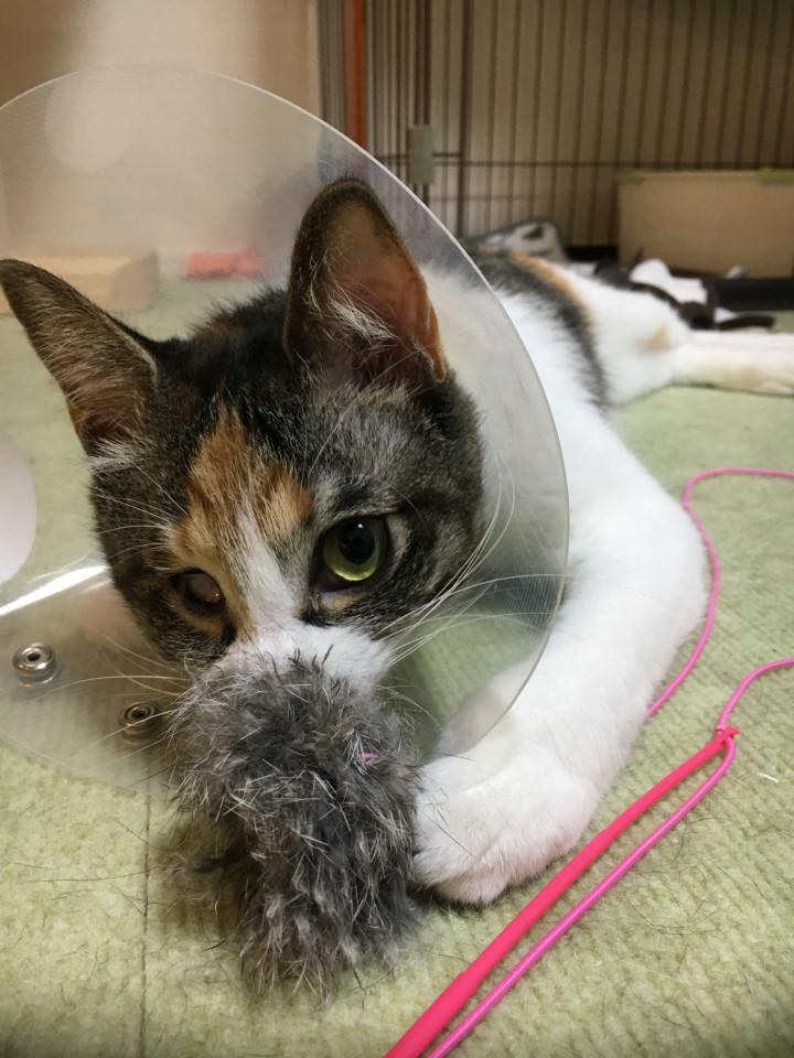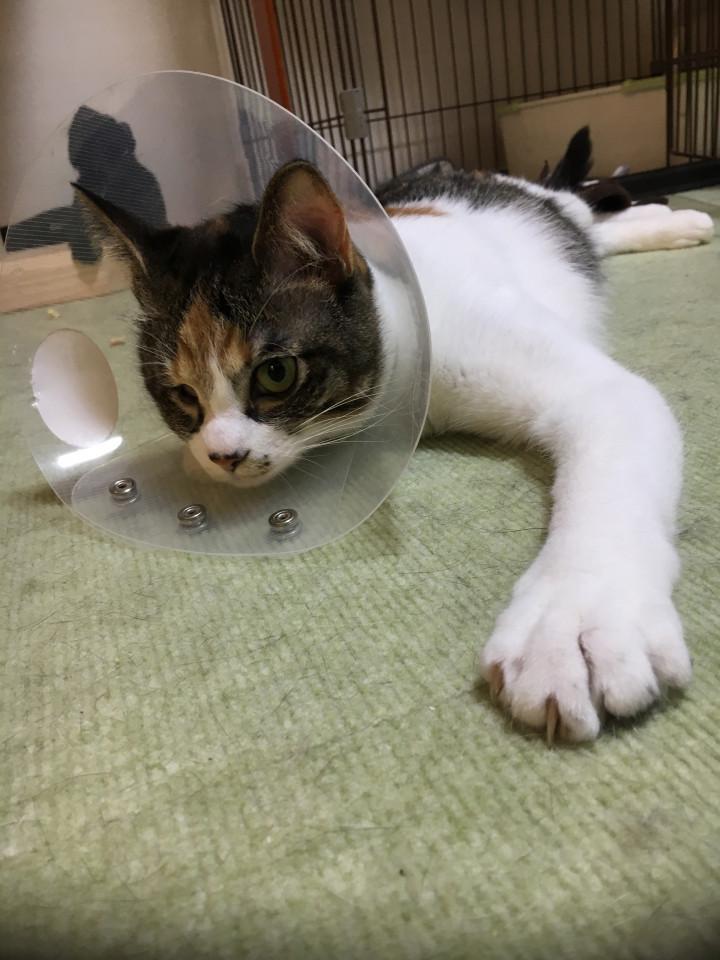 けんたろがよくえみちゃんの首を吸うので予防のためにエリザベスカラーもしました。