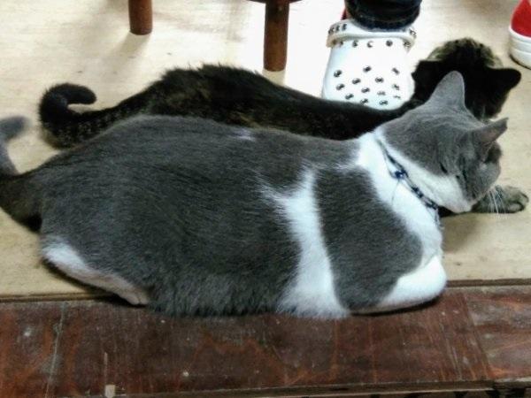うちの旦那の足元でブラッシング待ちのチエ&テツです。