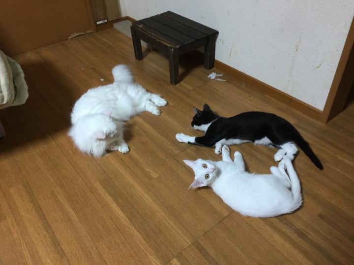 まだまだシロのチビ猫達に対するシャーッはありますが、チビ猫達の存在をしっかり認め、3匹の距離感はかなり縮んでいます。