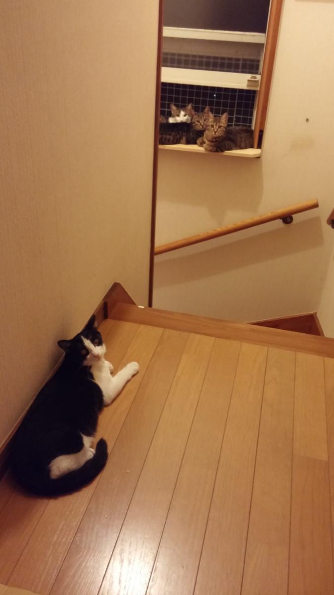 階段の窓も開けて安心ワイヤーネットガードしてます