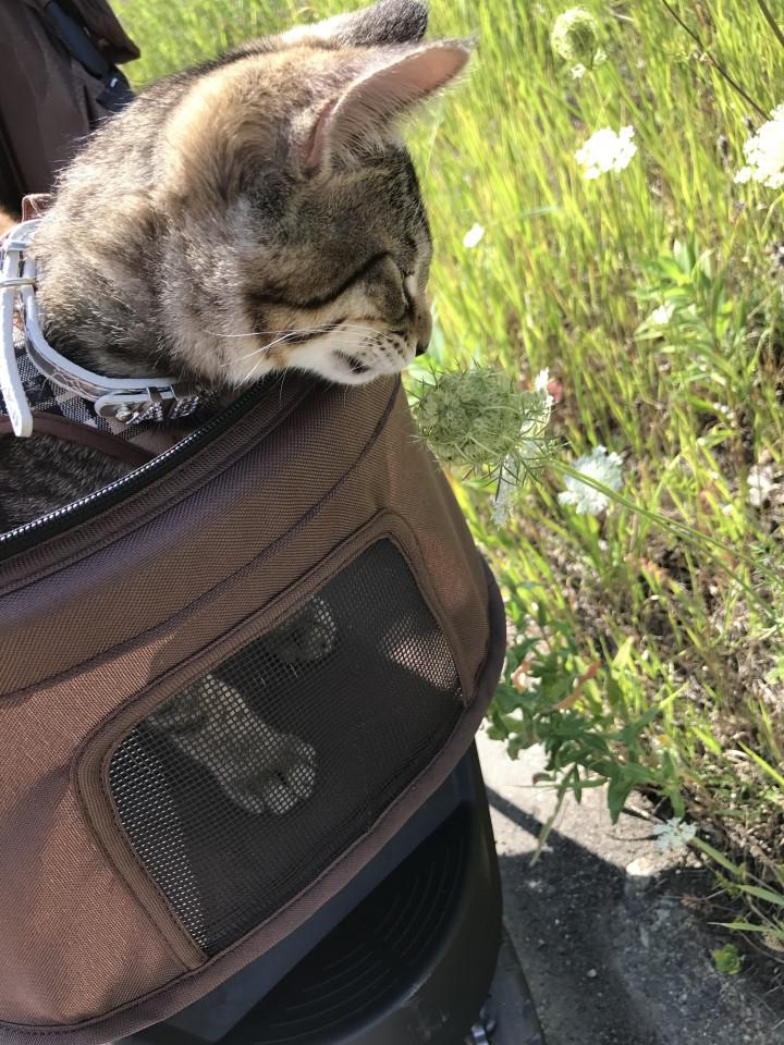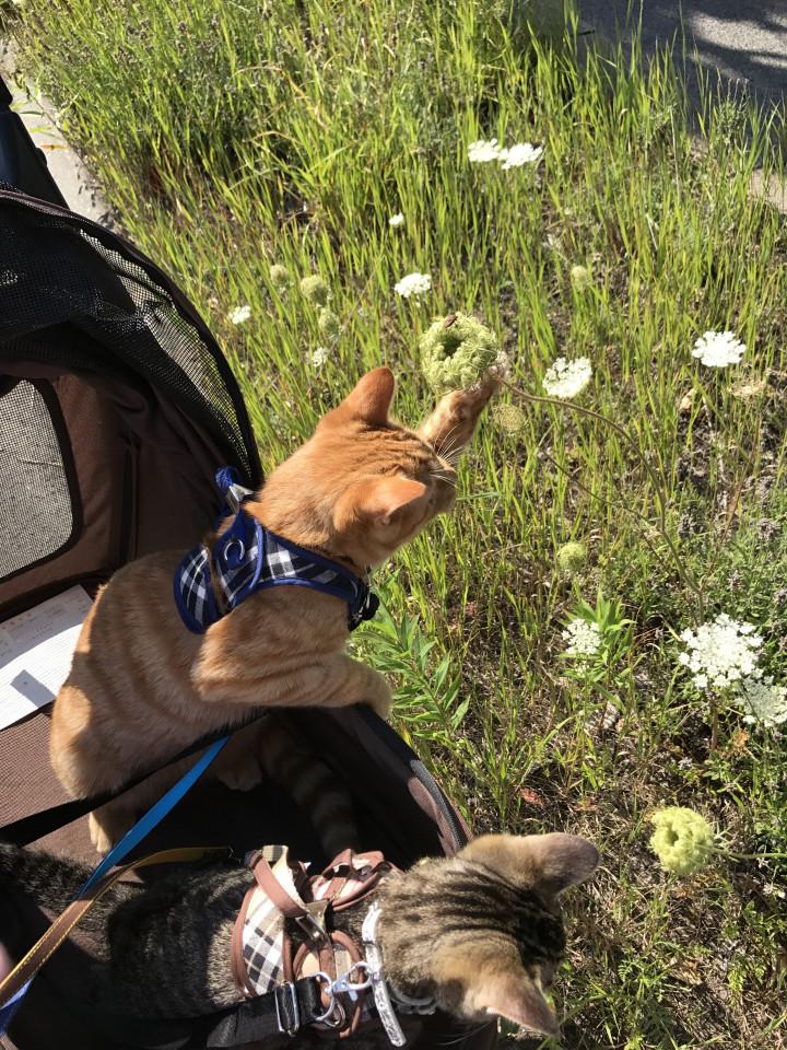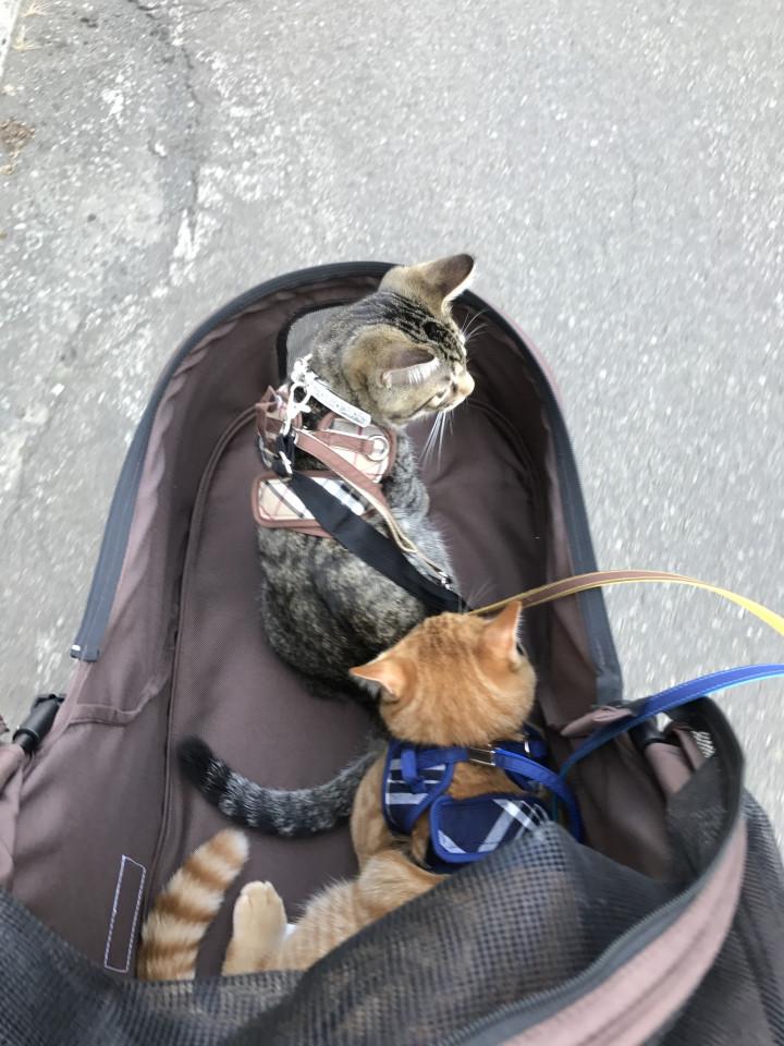 【ハーネス、ハーネスのリードは私の手首に、万が一の脱走、落下防止にバギー内にあるリードと首輪繋いでます】(*ˊૢᵕˋૢ*)