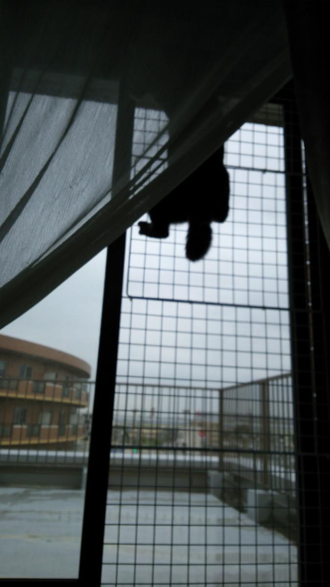 サッシの溝にワイヤーネットを挟んで窓は突っ張り棒で動かないようにしています。