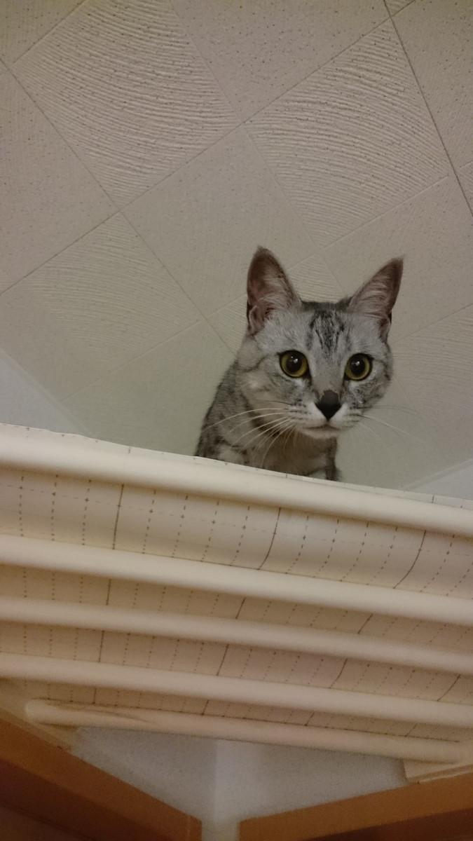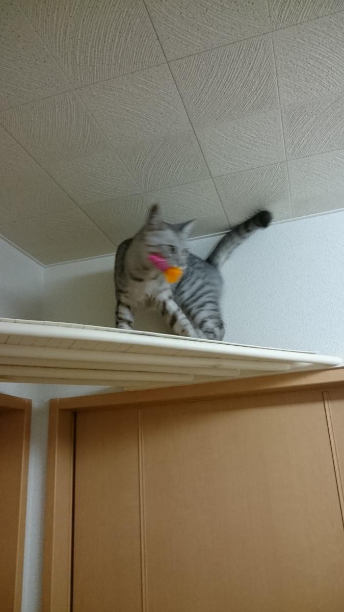 コーナーハンガーにネズミのおもちゃ(命名 チュチュ)を投げ込むと、「ニャニャッ!」と取りに行き、くわえて降りてきます!