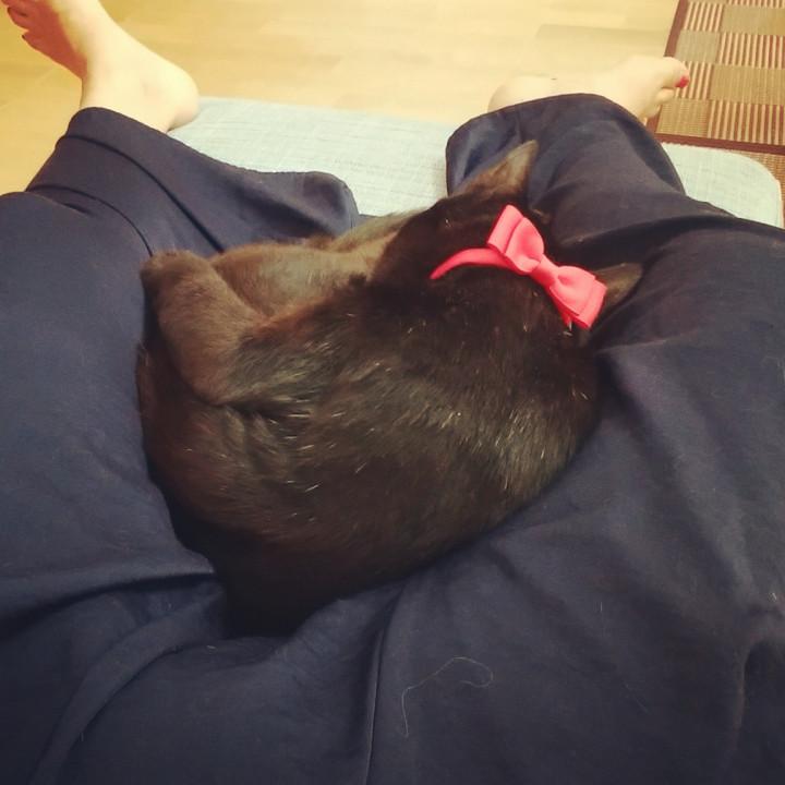 夫が夏休みに入ってから、黒にゃはほぼフリー。夜もリビングで夫と一緒に寝ています。