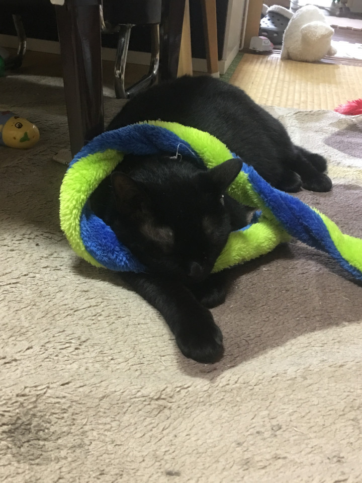 暇すぎてママ猫と遊ぼうとして遊んでくれないから巻きつけたら無反応で寝た…(T ^ T)
