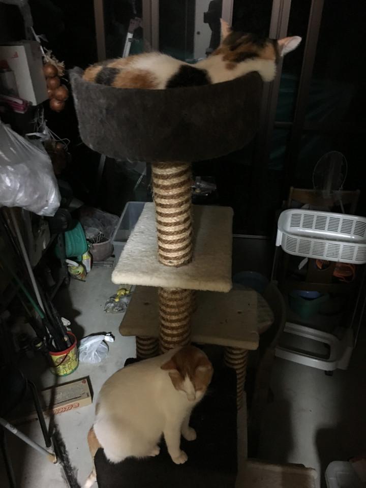 急いで、木ネジで止めて修理し、現状のように復活しました。ついでに椅子以外の緩んだ場所も補修して、3匹が一緒に乗っても頑丈に修理しました。