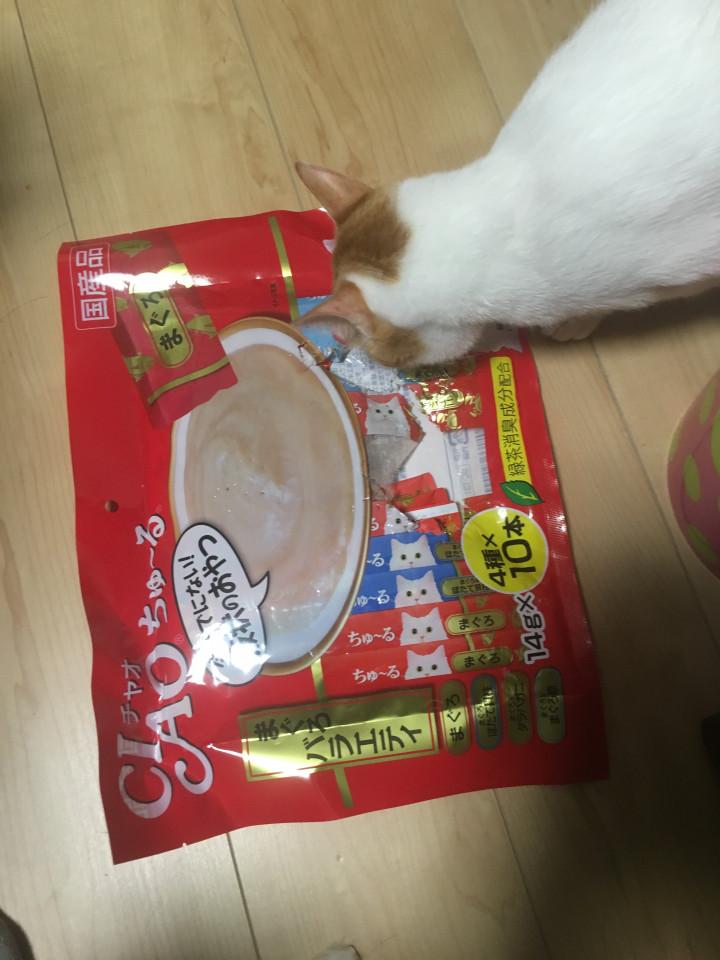 ムタ〔キジシロオス1歳〕は食いしん坊なのですが、棚の上に置いていたチュールをかじられました(^_^*)これはムタにかじられたチュールの袋です。見に来ているのはラム〔茶シロメス1歳〕です。両方とも食いしん坊です。