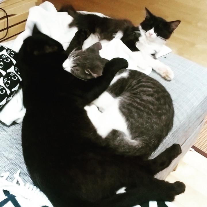 ハイジが甘えて、黒にゃが毛づくろい。ゴマも側にきてごろん。