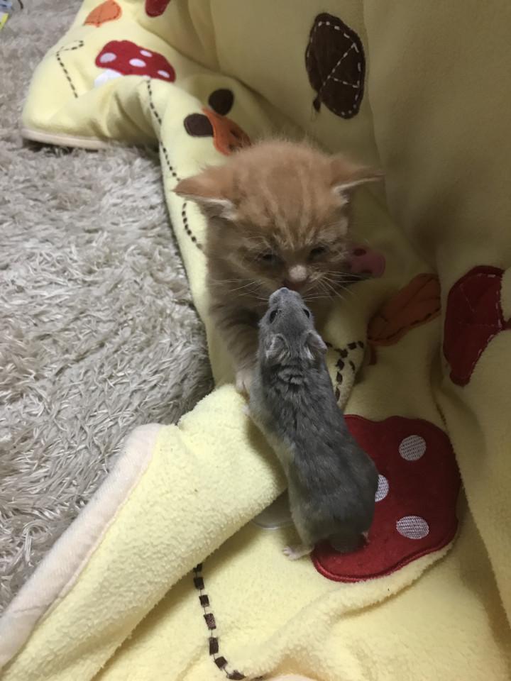 っても来た時生後1ヶ月にもなってないこんな感じのハムスターと写真撮っても、ハムスターに鼻チュ♡ってされるレベル(笑)