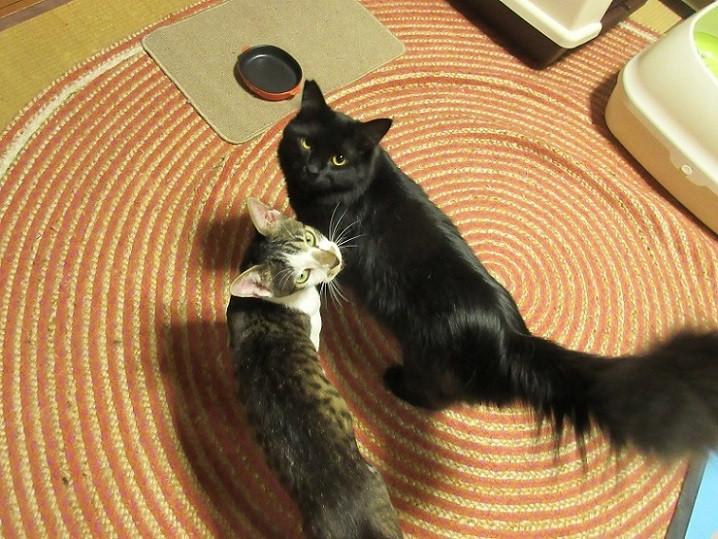 喧嘩もせずそれぞれラグの上でくつろいでいてナツとチャオはじゃれていますが、
