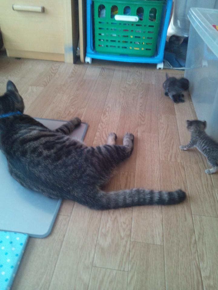 ヨチヨチと脱走する子猫を常に傍で見張ってます。