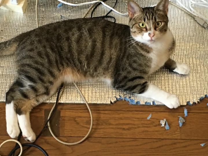 今日分かったことですが、シートがポロポロにされて、誰がやっているのか分かりませんでしたが、ムタがシートを咥えているの見つけました。どうやら、僕の部屋に来て、遊んでいるようです。