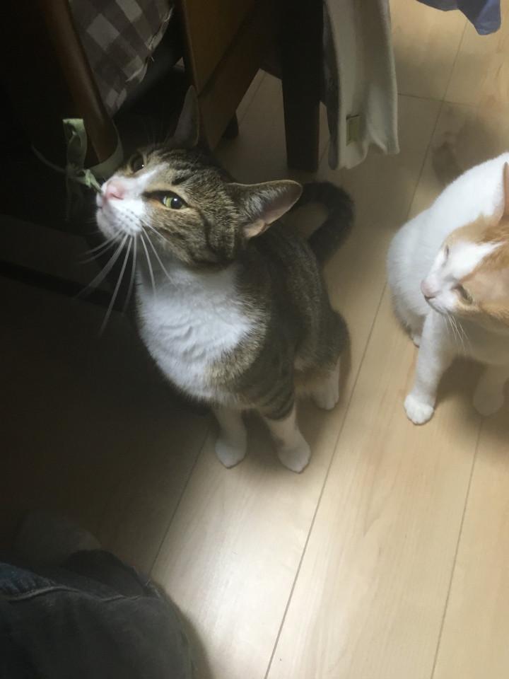 先住猫のタマ〔三毛猫2歳メス〕とラム〔茶シロ1歳メス〕の後をついて来るムタですが、少しずつ安心感を得て、家族になって来ました。
