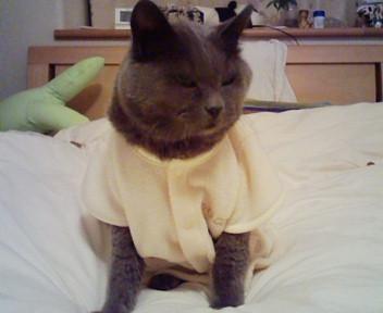 着ているのは(人間の)新生児用のスリーパーです。フリースのベストみたいな感じ。 ひよこ付き